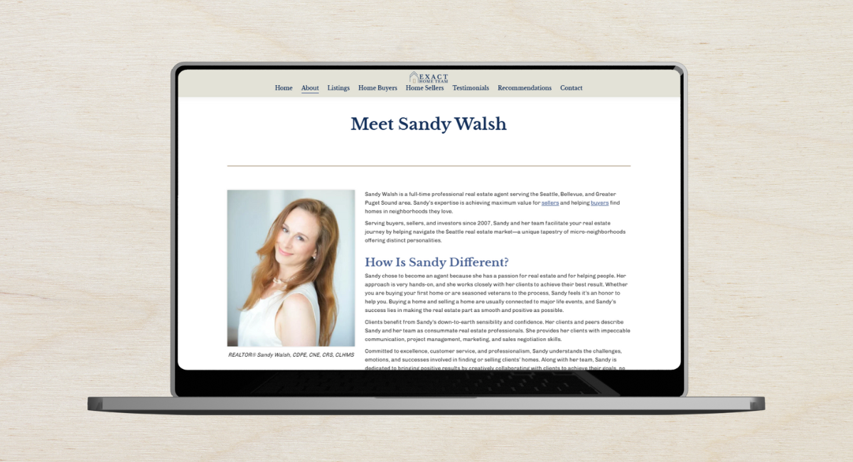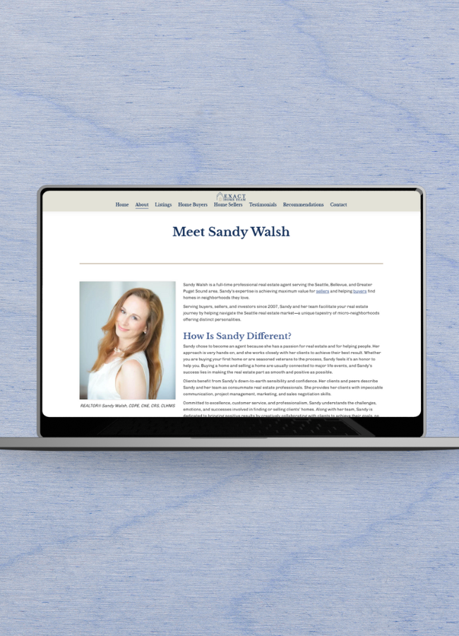 We crafted a Meet Sandy page to delve into her background, highlighting the fact that she is a 6th generation Seattle native as well as her decades of experience working in real estate. Additionally, we created a page dedicated to differentiators specific to Exact Home Team, including the impressive fact that 95% of clients are repeat clients or referrals from clients. We also created a Meet the Team page, and brought it to life with photos and bios of Sandy’s supporting team. We highlighted the roles each individual on the team plays in helping clients throughout the buying or selling process.