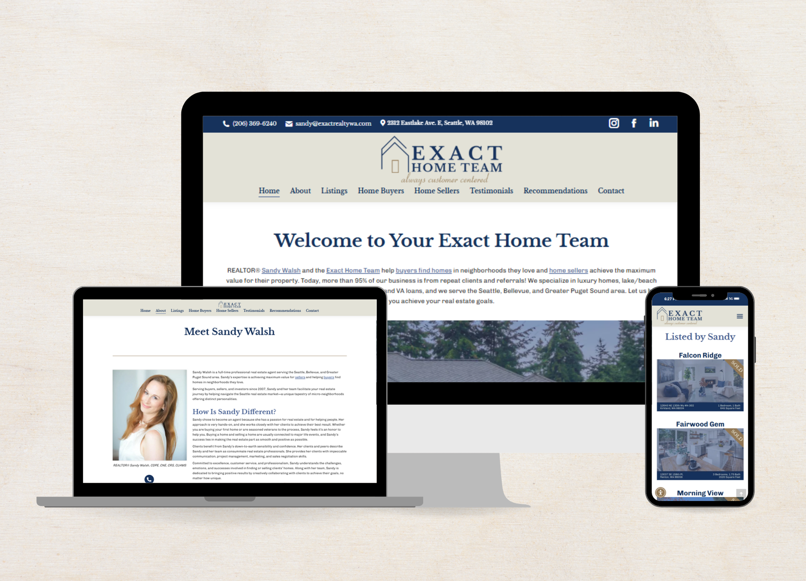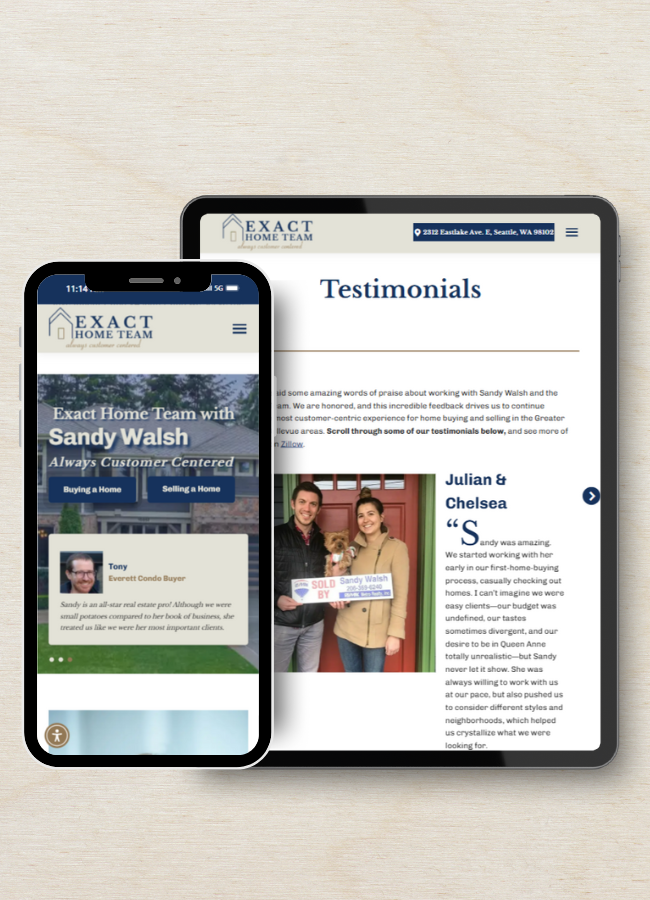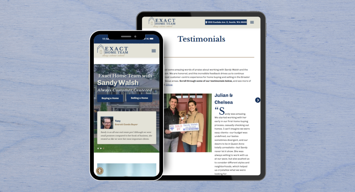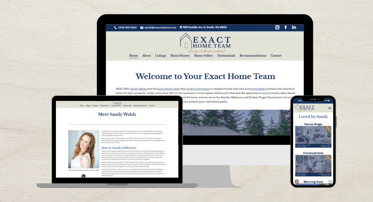 Exact Home Team deserved a website that truly showed off REALTOR® Sandy Walsh’s impressive portfolio of experience and extensive real estate knowledge. We wanted to highlight her deep roots in Seattle and her decades of helping both sellers and buyers in the area. Most of all, the website needed to clearly show active listings. Our goal was to create a website with a clean, modern design, filled with all of the important details while highlighting sold homes and shining testimonials.