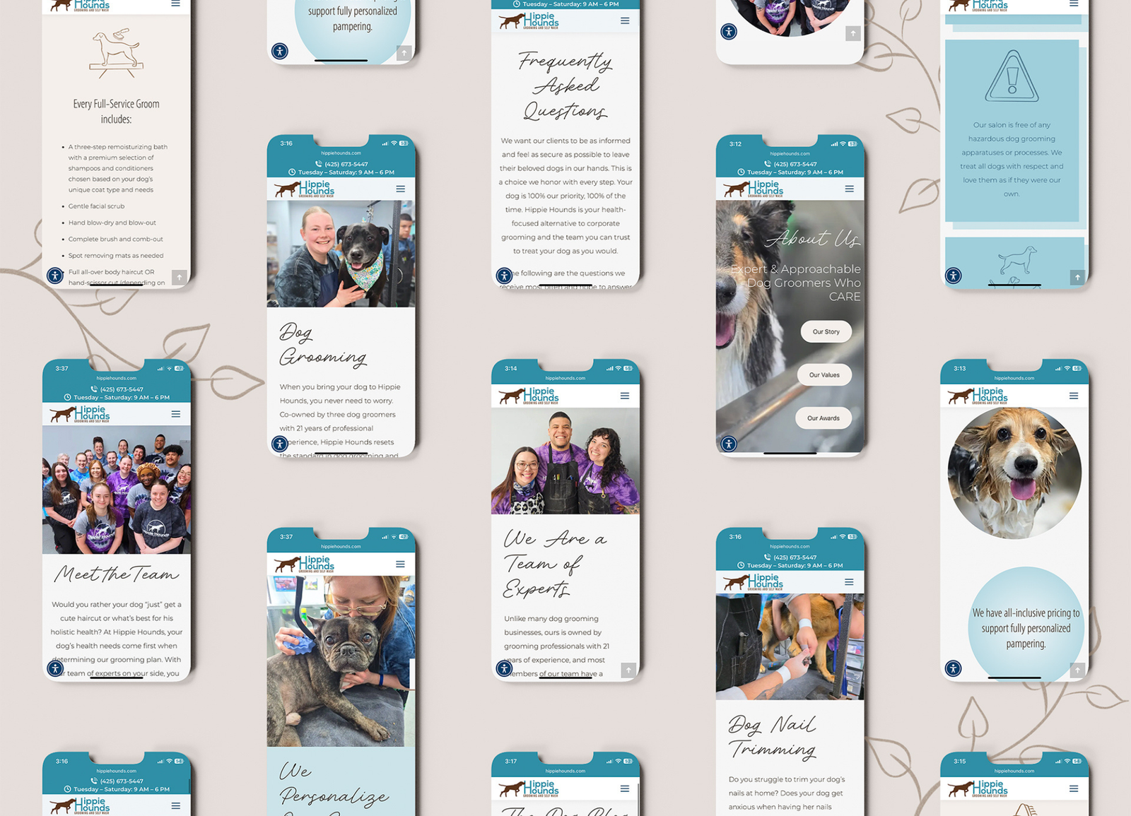After a long conversation with owners Amanda, Anna, and Aaron, we began to develop a vision that would meet and exceed their digital marketing goals. We set off to create a website that, when visited, mimicked the feeling of stepping into their salon. The website would be welcoming, comfortable, informative, and showcase their fun, friendly, and vibrant team who make each customer feel valued, and each dog feel at home. We wanted the site to feel clean, light, and airy to match their authentic and holistic “hippie” branding, while embedding their social media feed to show their personality and a blog to share their dedication to education.