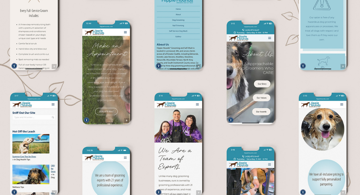 The owners of Hippie Hounds wanted to be in love with their website, but they weren’t — it was just “okay.” Importantly, it worked. It highlighted pertinent information like the services they offer and their business hours, but it lacked personality and storytelling. The images were stock photos — a waste because every groomer’s camera roll was running out of storage with amazing pictures of real, happy dog customers, just waiting to be put on display. The navigation was confusing, the content lacked SEO, and overall, the site was a static, boring, and inaccurate portrayal of the vibrant, energetic, and wholesome environment of the physical salon.