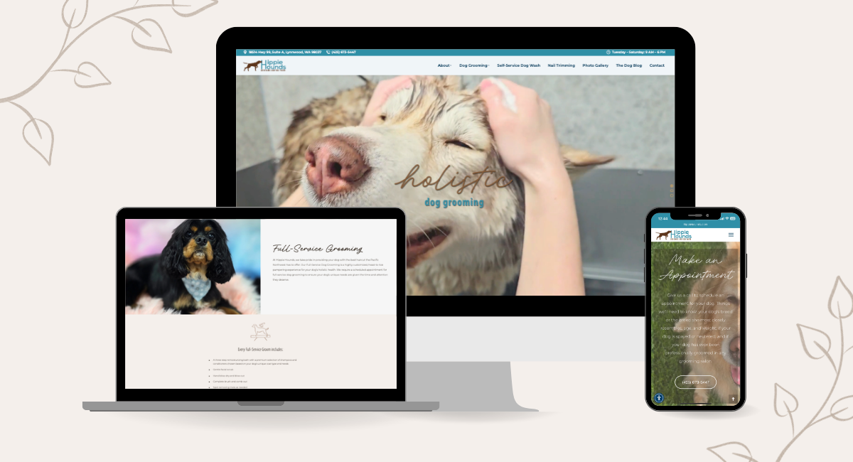 We brought a once-stagnant site to life through images and video. The passionate team behind this business captures amazing content daily. We strategically used this media throughout the website, with a commitment to using only their images. So long, stock photos! We created a captivating video filled with three minutes of cute and happy dogs to greet site visitors on the home page. This video not only showcases the shop’s interior and pulls you into the space, but it’s also a perfect visual for the tender love and care each dog receives when they’re dropped off at Hippie Hounds. Nothing puts a dog owner more at ease than the undeniable truth of a tail-wagging pup on the grooming table.