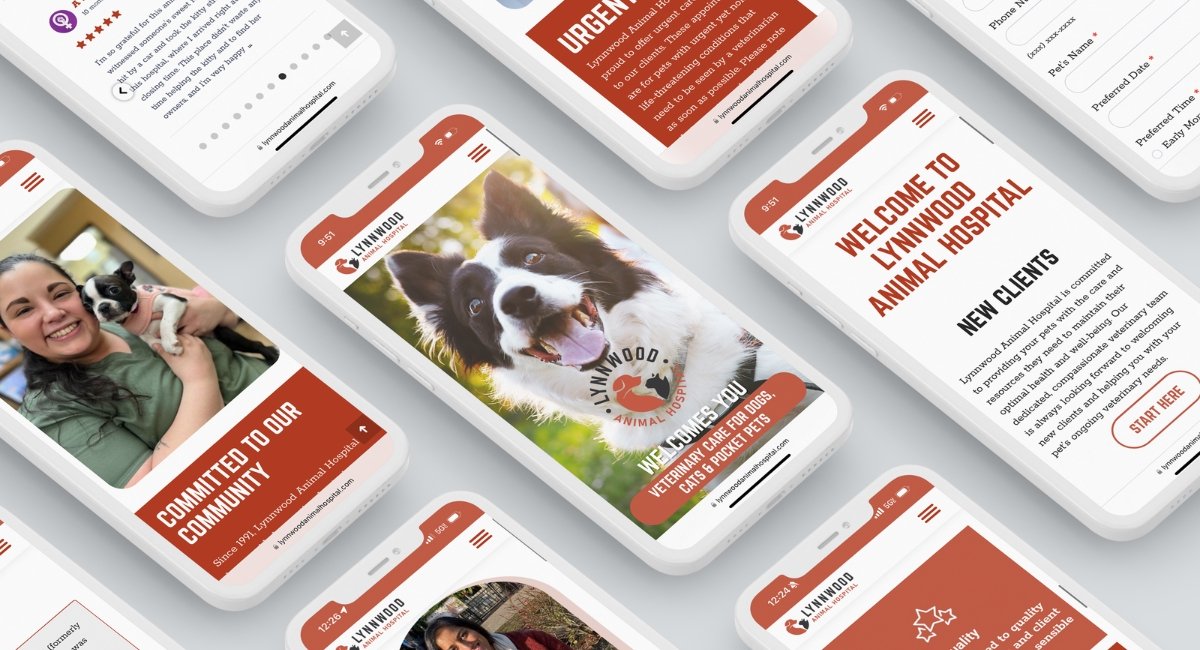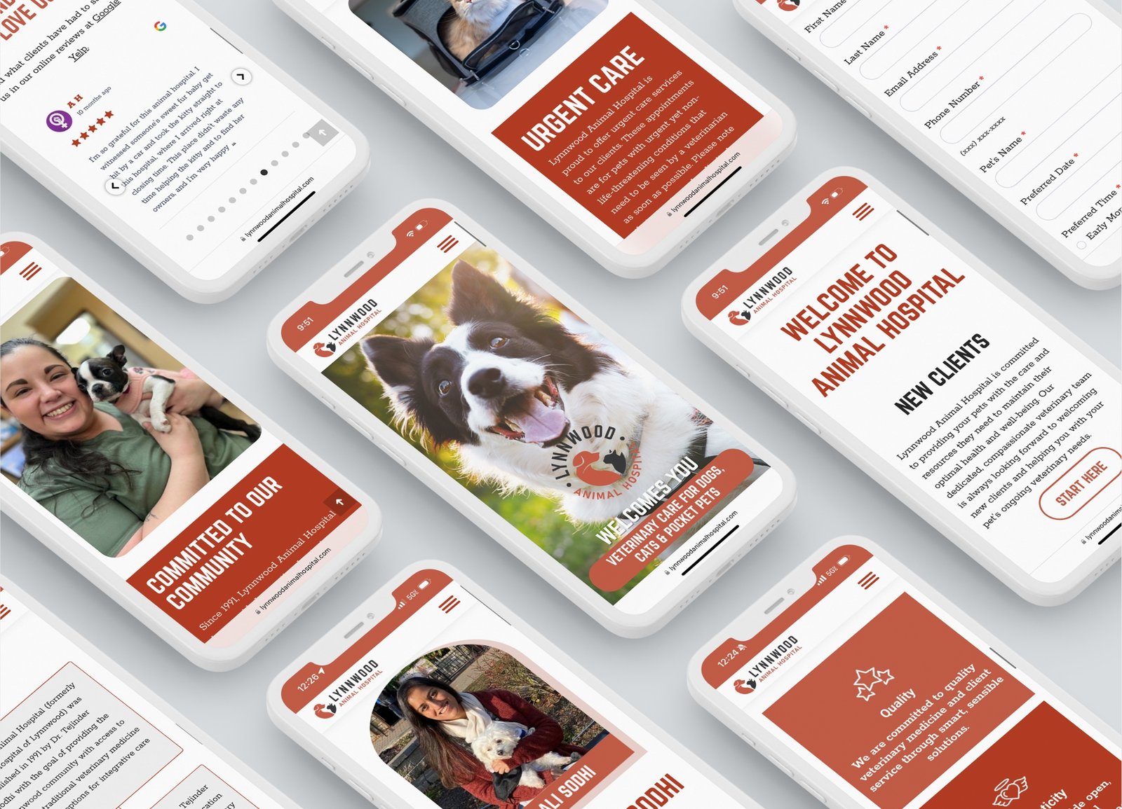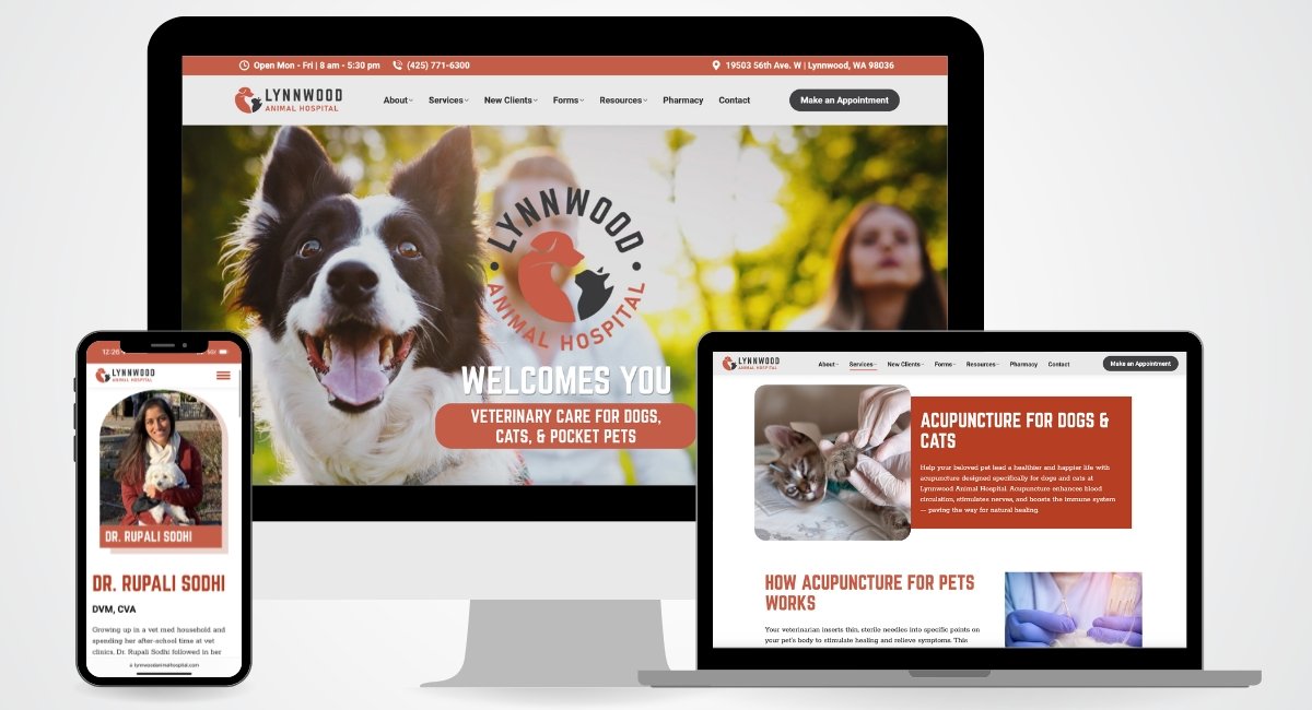 Lynnwood Animal Hospital, the newest addition to the Veterinary Roots network, is dedicated to providing high-quality veterinary care for pets in Lynnwood, Wash. We’ve had the pleasure of working with our long-time client, Veterinary Roots Owner Dr. Debra Nicholson, and the Vet Roots team since 2016. We were thrilled to have their trust in our services and to support them in this new chapter. As soon as we got the green light, we dove headfirst into redesigning Lynnwood Animal Hospital’s preexisting site to reflect the Veterinary Roots brand guidelines. Serving dogs and cats as well as ferrets, chinchillas, rabbits, and rodents (aka Pocket Pets), Lynnwood Animal Hospital is committed to delivering compassionate care in all services. Thus, we knew our mission: Highlight the clinic’s range in care and all essential information with a skillfully crafted, visually friendly, and easily navigable online experience.