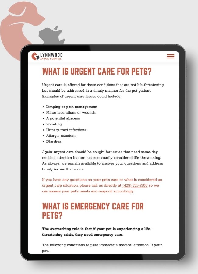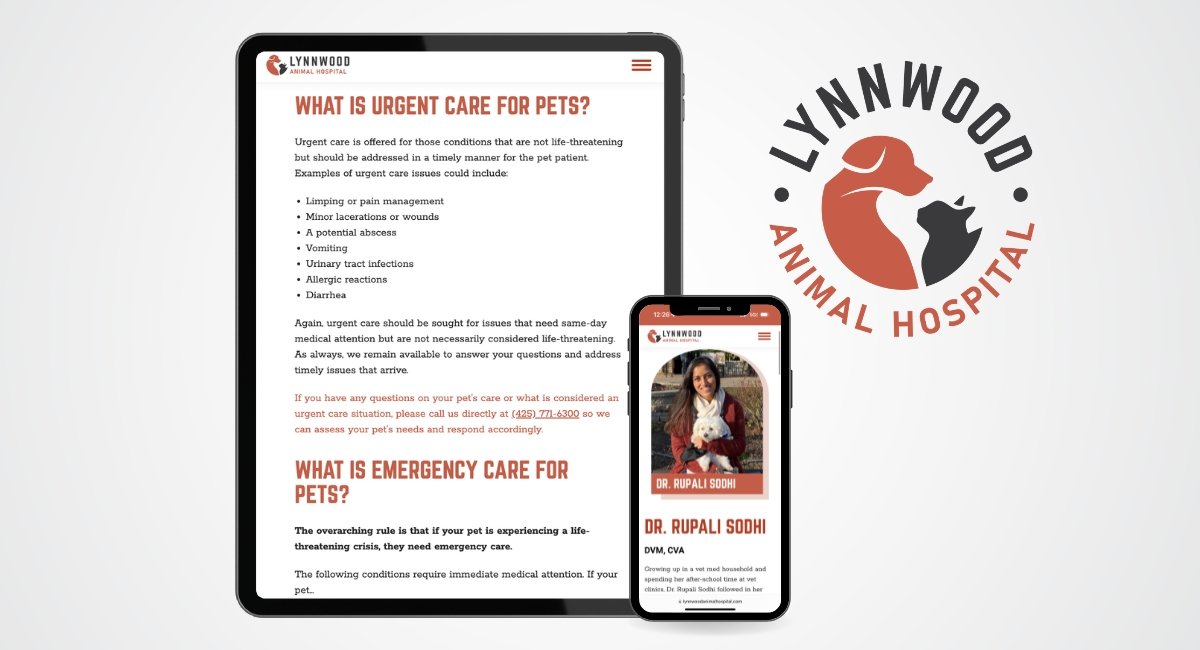 Lynnwood Animal Hospital appreciated the inviting and modern designs we’ve created for their other locations, such as Bothell Pet Hospital, and their sister non-profit organization, Rainier Animal Fund. It was important to our clients that we showcase the connection between pets and their owners while maintaining a professional look. We also knew we had a steep hill to climb with search engine optimization because Dr. Nicholson changed the clinic’s name from Animal Hospital of Lynnwood to Lynnwood Animal Hospital. In addition, a flashy new emergency vet opened a mile away just weeks after Dr. Nicholson purchased the clinic, creating more competition