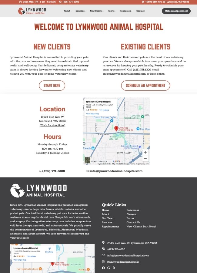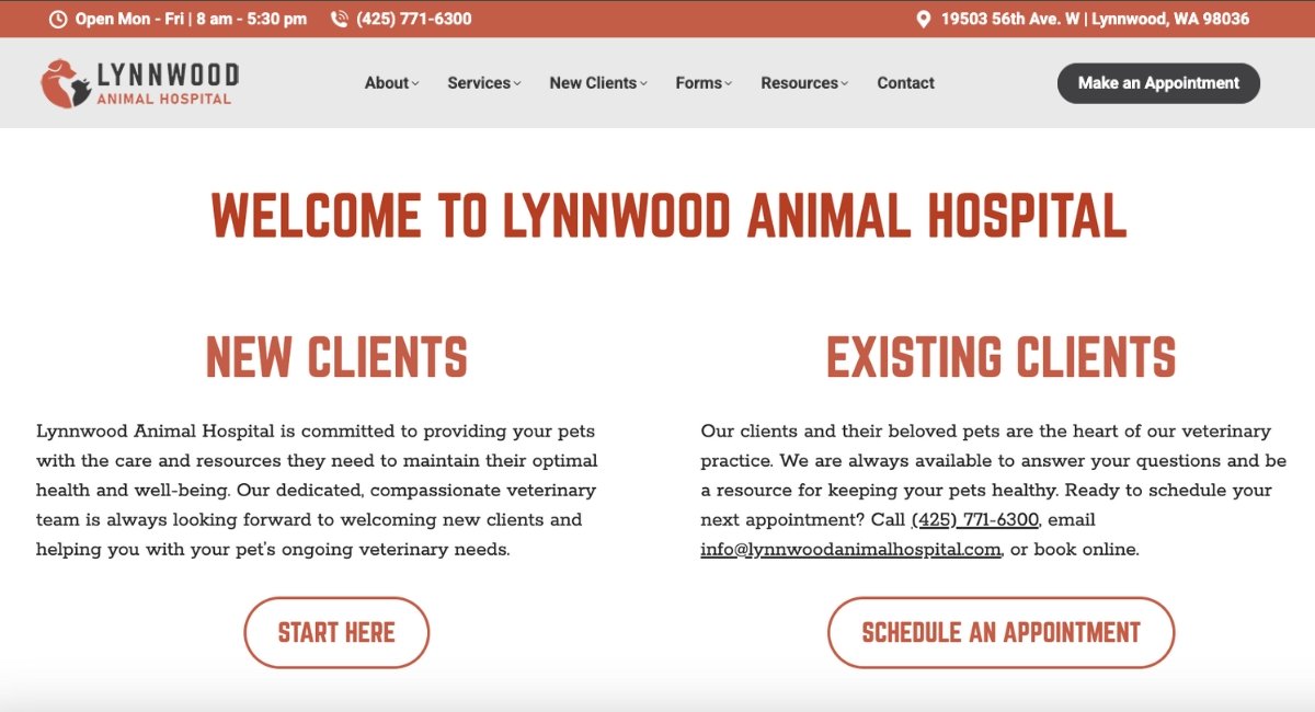 With the clinic under new ownership and with a new identity, Dr. Nicholson and her team were anxious to drive new clients to the website. The original website felt cluttered and overly focused on unprofessional elements that didn’t align with Lynnwood Animal Hospital’s new brand. The content was scattered across multiple pages, creating unnecessary layers for site visitors to click through and making it challenging to locate essential information. This disorganization made the site frustrating to navigate and showed the need for a clearer, more user-friendly design.