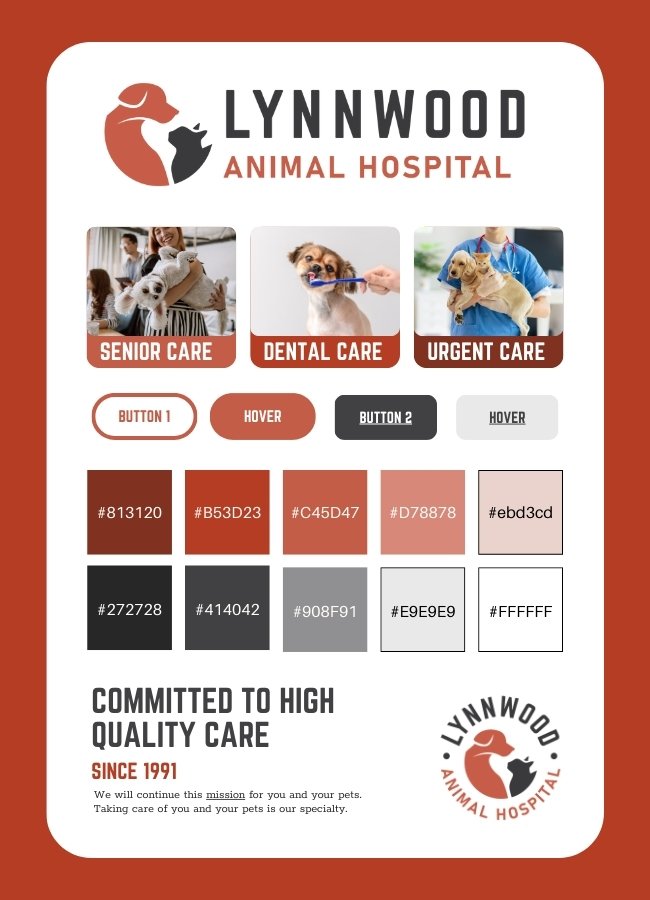 We brought Lynnwood Animal Hospital’s brand to life with a redesign that feels bold, approachable, and professional. Using the clinic’s newly redesigned logo and two-color palette as a foundation, we expanded the color range and incorporated bold typography for a polished look.