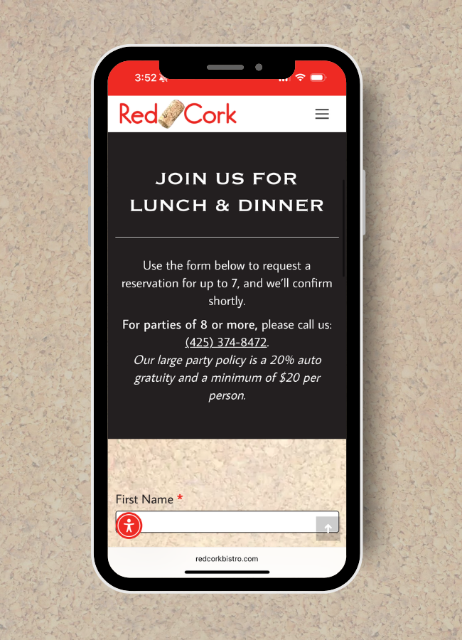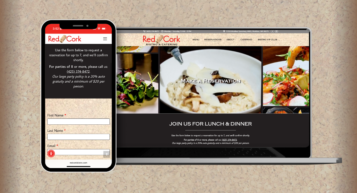 One of the biggest improvements we made for Red Cork Bistro was streamlining their reservation system. Before our website design, customers would submit a request, but the team had to manually call each person on the phone to confirm, adding unnecessary steps and extra work for the staff and diners. We knew we could build a better way.