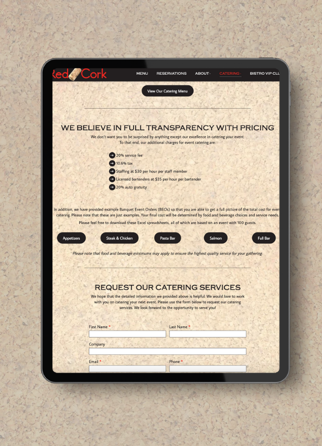 Another major improvement we made for Red Cork Bistro was simplifying the catering booking process. Before working with us, Adrian was answering the same questions over and over, providing pricing and event details individually to each booking inquiry. Since transparency is one of RCB’s core values, we saw an opportunity to put all of that information front and center, making it easier for both the restaurant and potential clients to see the information they’re looking for.