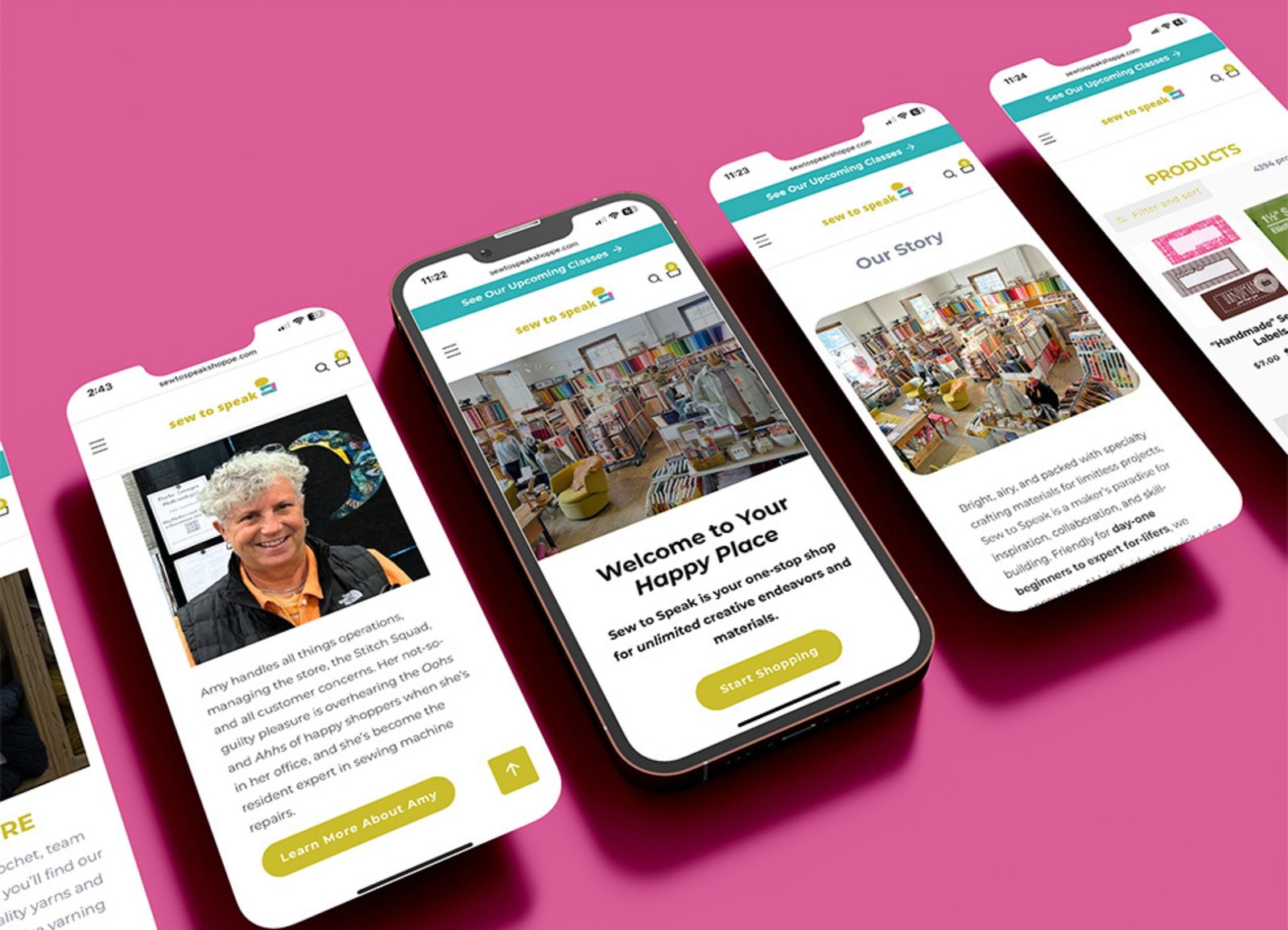 Sew to Speak is powered by the amazing, creative, passionate individuals of the “Stitch Squad”, but the team feature was missing from the original website. To highlight these talented individuals, we developed a questionnaire to seamlessly add each staff member and teacher’s story to the site as they joined the team. We also encouraged the Stitch Squad to take headshots inside the store for consistent imaging across the Team page and stronger ties to the in-person store throughout the site.