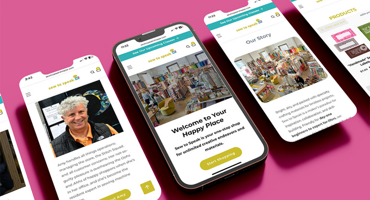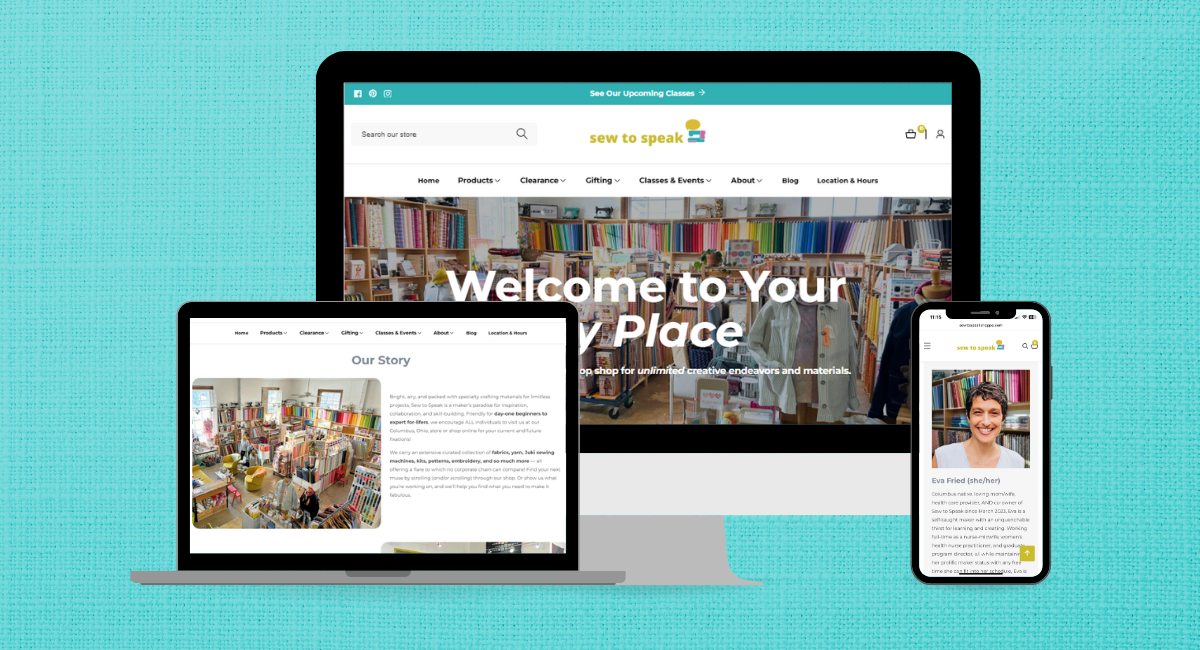 For so many, Sew to Speak is a “happy place” and an escape from the chaos of the world. Customers leave their problems at the door and dive into the endless opportunities for creative and energizing work. We wanted the website to mimic that special feeling. We chose a bright and bold design to match the brand, with an emphasis on color and elements as cute as a button. We upgraded to high-quality images of products, and we featured images of the physical store throughout the site, allowing online users to truly see the yarn and fabric-lined walls that house creative makers from all across Ohio.