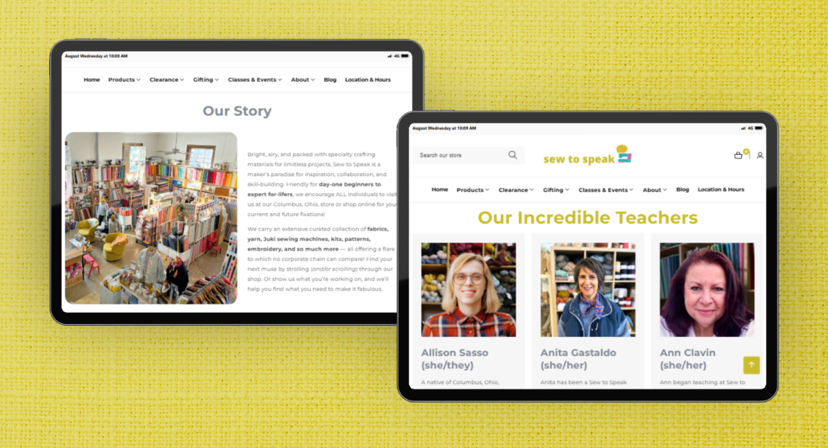 The original Sew to Speak website’s home was in Shopify, and because that platform made the most sense for Sew to Speak, our flexible designers honed our Shopify expertise. We optimized the store’s Shopify space for navigability and the customer experience. In collaboration with the Sew to Speak team, we enacted a digital “extreme makeover,” overhauling the disheveled site and recategorizing the inventory of more than 5,000 products. This led to us restructuring the entire e-commerce portion of the site, creating new categories, and sorting product tags to create an effortless online shopping experience.