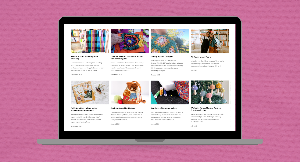 When we began working with Sew to Speak, the blog was full of unorganized posts written years ago. Valuable blogs (e.g., Yarn Weights 101) were buried beneath dated posts, like a how-to guide for sewing a face mask from the summer of 2020. We implemented a complete blog refresh alongside the website redesign to sort and optimize existing blog posts as well as create several brand new and SEO-driven posts to bring the blog into the present. Our inspiration was seasonable, relevant, and vibrant topics for makers that feature the latest products from the shop and project inspirations from the “Stitch Squad”, reflecting the shop’s energy and the helpfulness you’d receive when shopping in person.