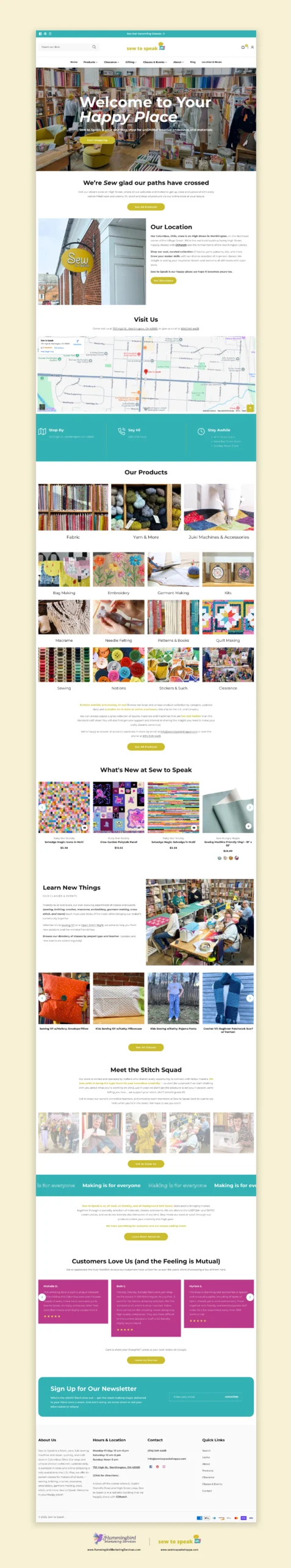 Originally, the Sew to Speak site was confusing for new customers trying to find the shop in person. We added a new Location Page that clearly showcases the address and hours of operation, and includes a map with an arrow to the store, making it easier than ever for first-timers to find their new favorite fabric shop.